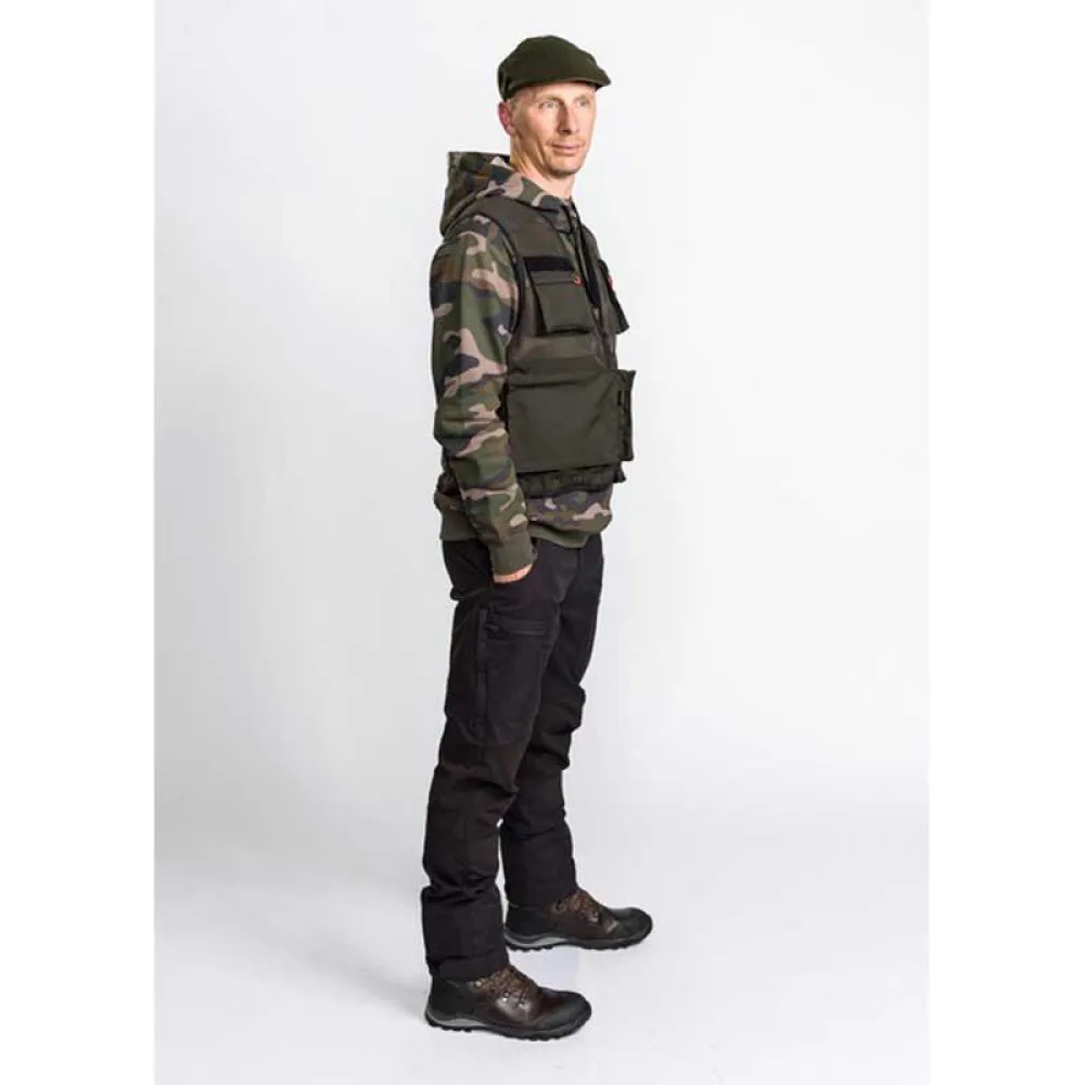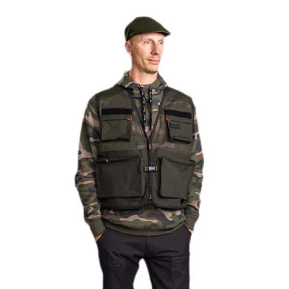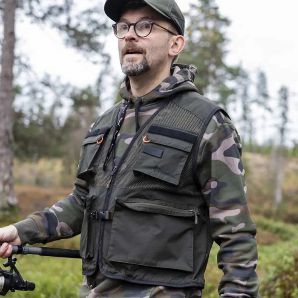 Leichte, atmungsaktive Anglerweste mit hochbelüftetem Mesh. Ausgestattet mit großen Fronttaschen. Halter für Angelruten und Fliegenfischköder. D-Ringe. Taschen groß genug für Angelboxen. Behandelt mit organischer und fluorkohlenstofffreier Imprägnierung – Bionic Finish® Eco für zusätzliche wasser- und schmutzabweisende Eigenschaften.