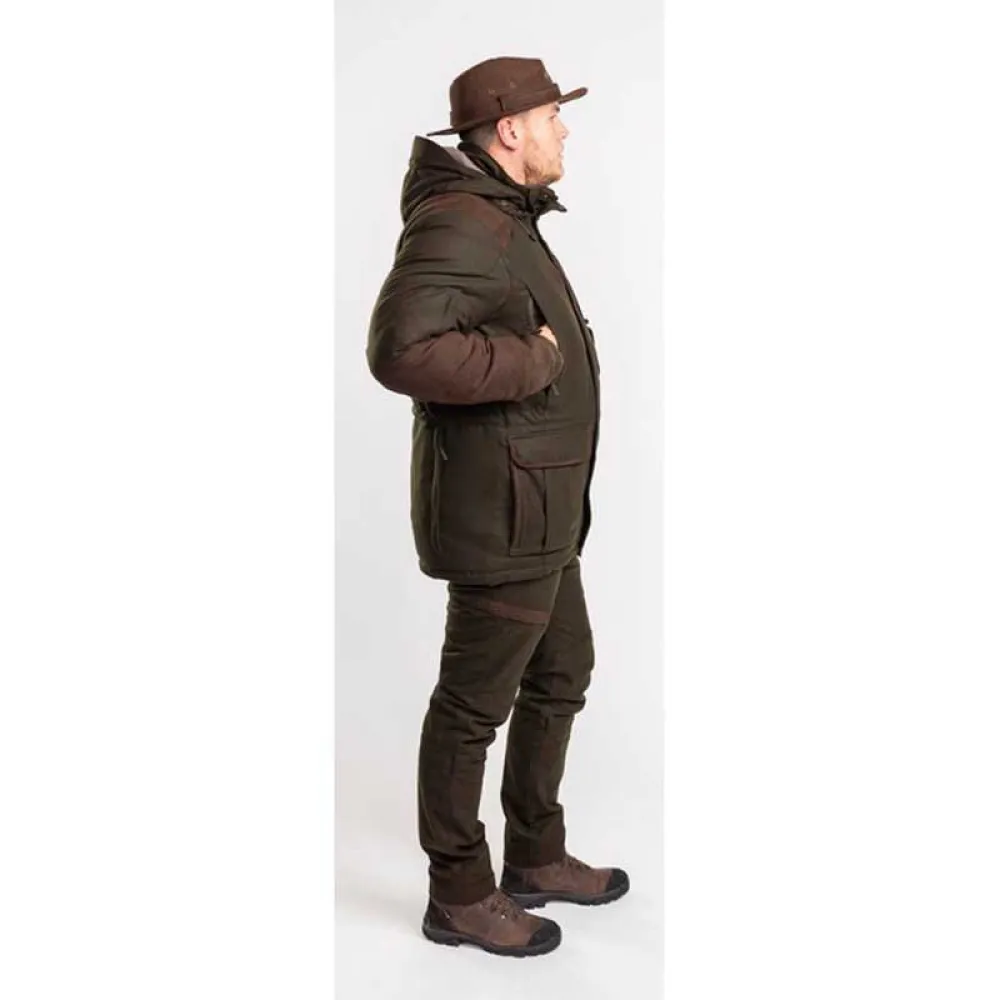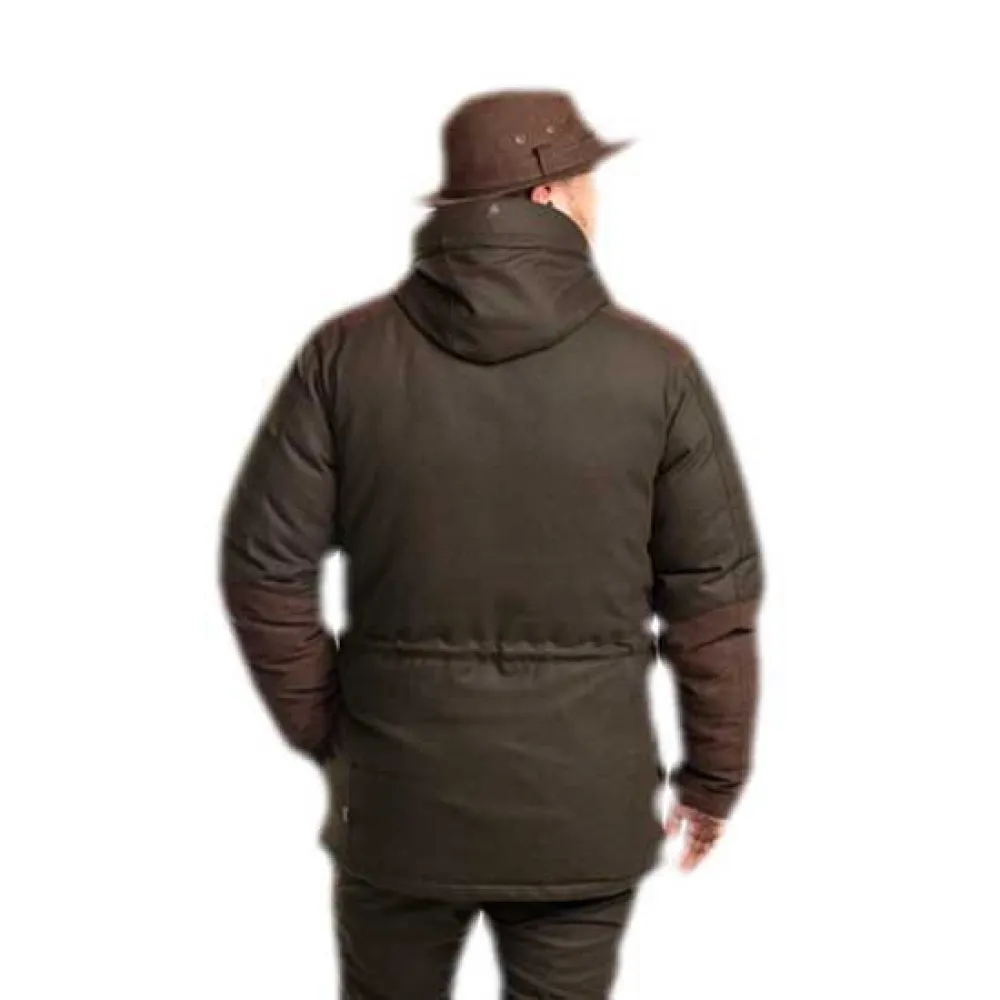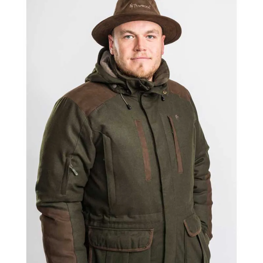 Nydala Insulation Wool Parka ist eine leise winddichte Jacke aus weichem Wollmischmaterial. Dieses Material hat den Vorteil, dass Wollfasern trotz Nässe Wärme spenden und selbstreinigend sind. Die Jacke ist extra warm mit doppelten Isolationsschichten. Die erste Schicht besteht aus einer Thermolite® EcoMade T-Down-Füllung aus 100 % recyceltem Polyester aus PET-Flaschen. Die zweite Schicht ist eine dünne Thermolite®-Polsterung aus 35 % recyceltem Polyester und 65 % Polyester. Es gibt eine abnehmbare Kapuze mit verstärktem Schirm, die mit einem Riemen leicht angepasst werden kann. Die Taille, der Po und die Manschetten können auch durch Riemen und Kletten reguliert werden. In den Ärmeln befinden sich Innenbündchen mit Daumenlöchern, um zu verhindern, dass Kälte in die Ärmel eindringt. Ein zusätzlicher orangefarbener Kragen sorgt für Sichtbarkeit, kann aber für ein subtileres Erscheinungsbild leicht eingesteckt werden. Die Sicherheitsausstattung wird durch eine Tasche mit integriertem Reflexband ergänzt. Die Jacke hat einen Zwei-Wege-Reißverschluss, der sich an beiden Enden öffnen lässt, und eine Knopfleiste mit Magnetknöpfen. Mehrere Taschen sind vorhanden, wie z. B. zwei große Fronttaschen, Handwärmertaschen mit Fleecefutter, zwei Brusttaschen mit Funkantennenöffnungen, eine Wildtasche und zwei Innentaschen.Diese Jacke hat schöne Details aus synthetischem Wildleder und lässt sich leicht mit einer breiten Hose aus der Pinewood-Kollektion kombinieren.